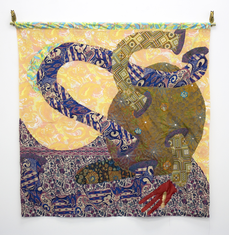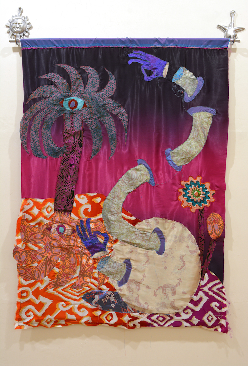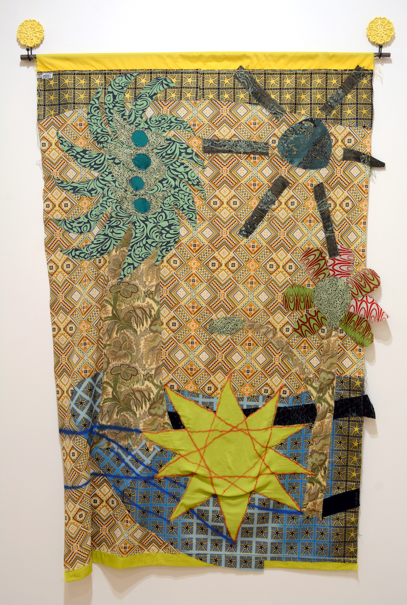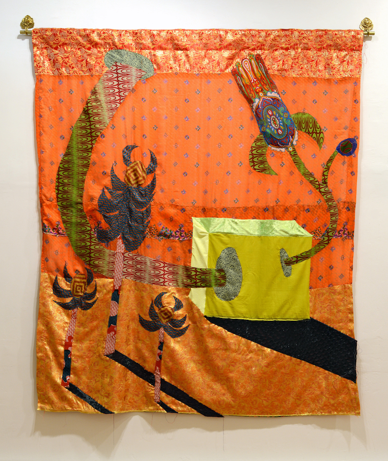Sewn Fabrics, acrylic paint, aluminum tube and hangers