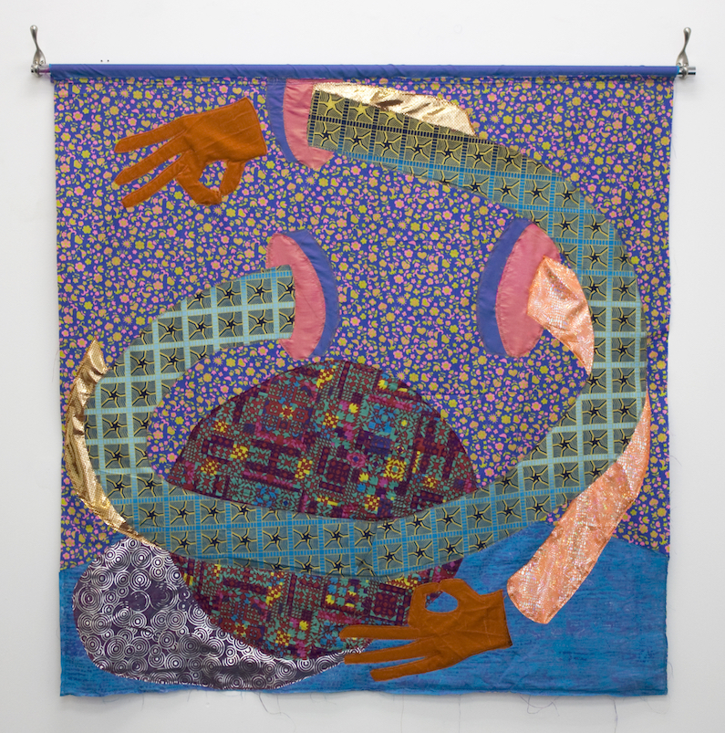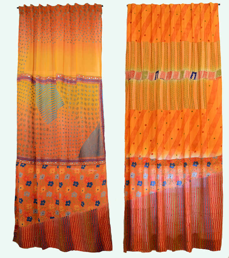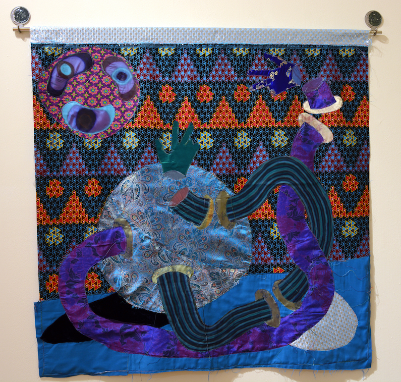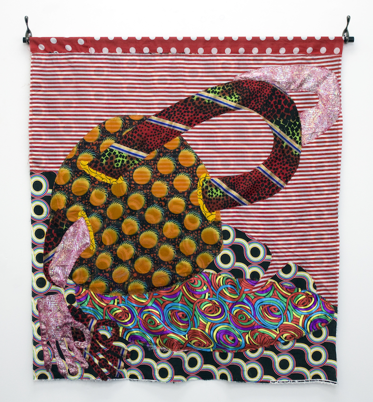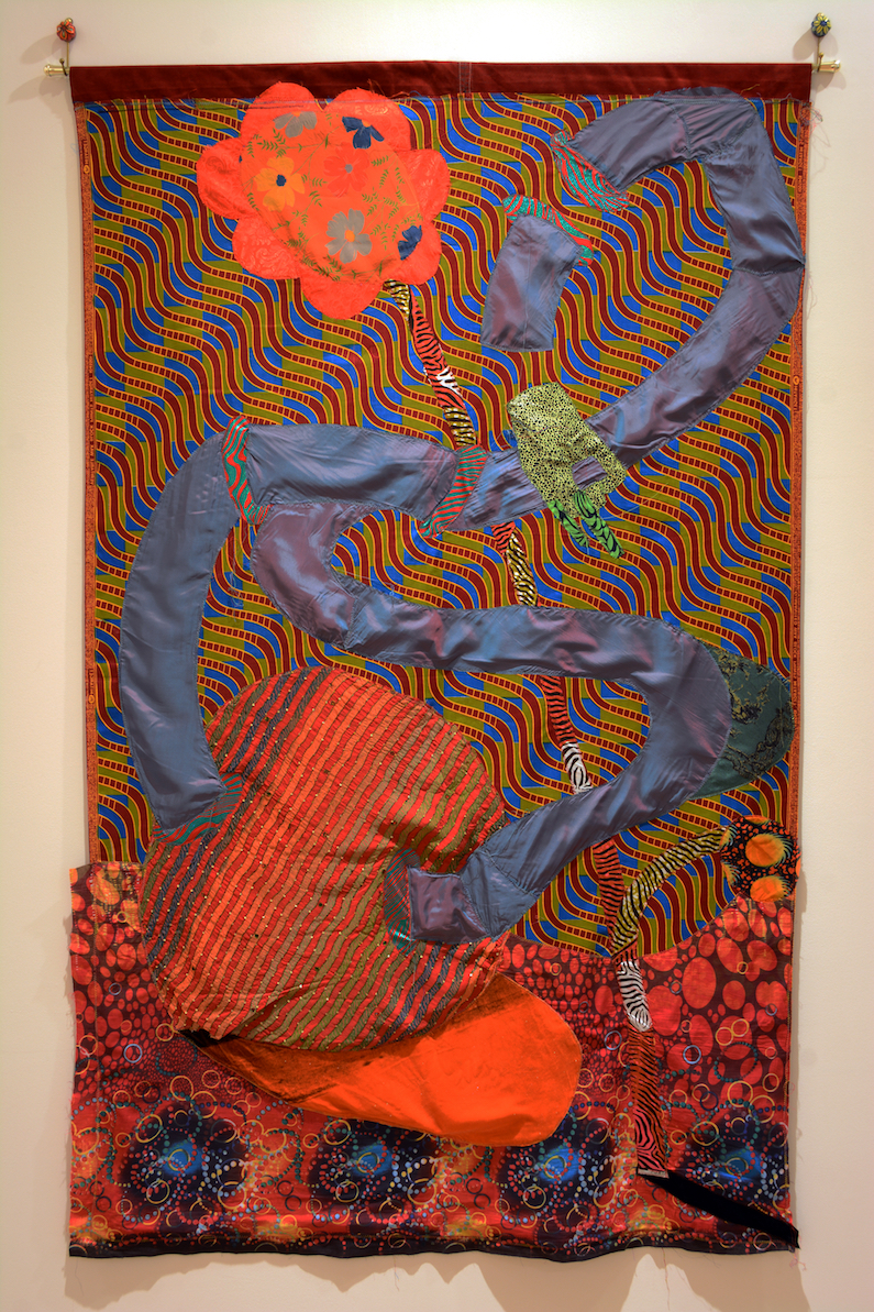 Sewn Fabrics, acrylic paint, aluminum tube and hangers